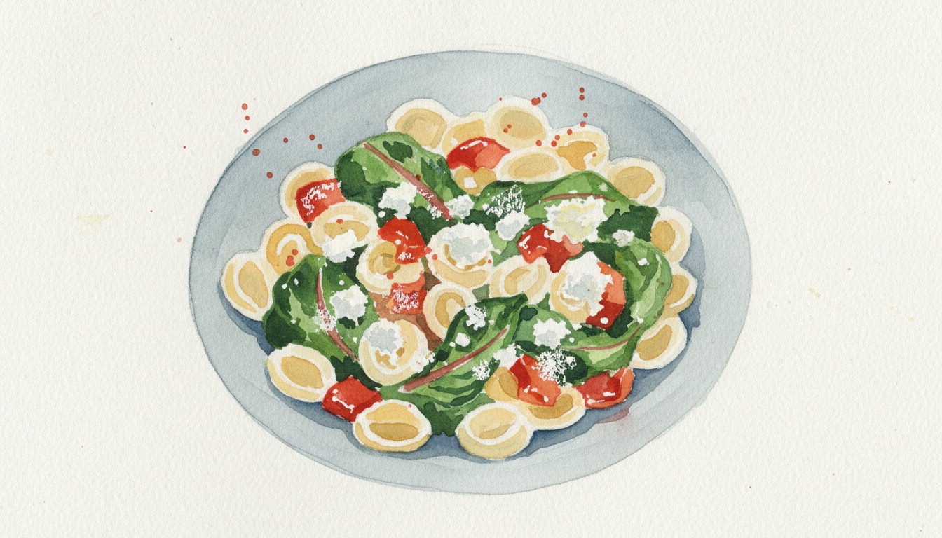 - Orecchiette ('little ears') is the ideal shape for this dish because the cup-like center scoops up the goat cheese and small vegetable pieces.