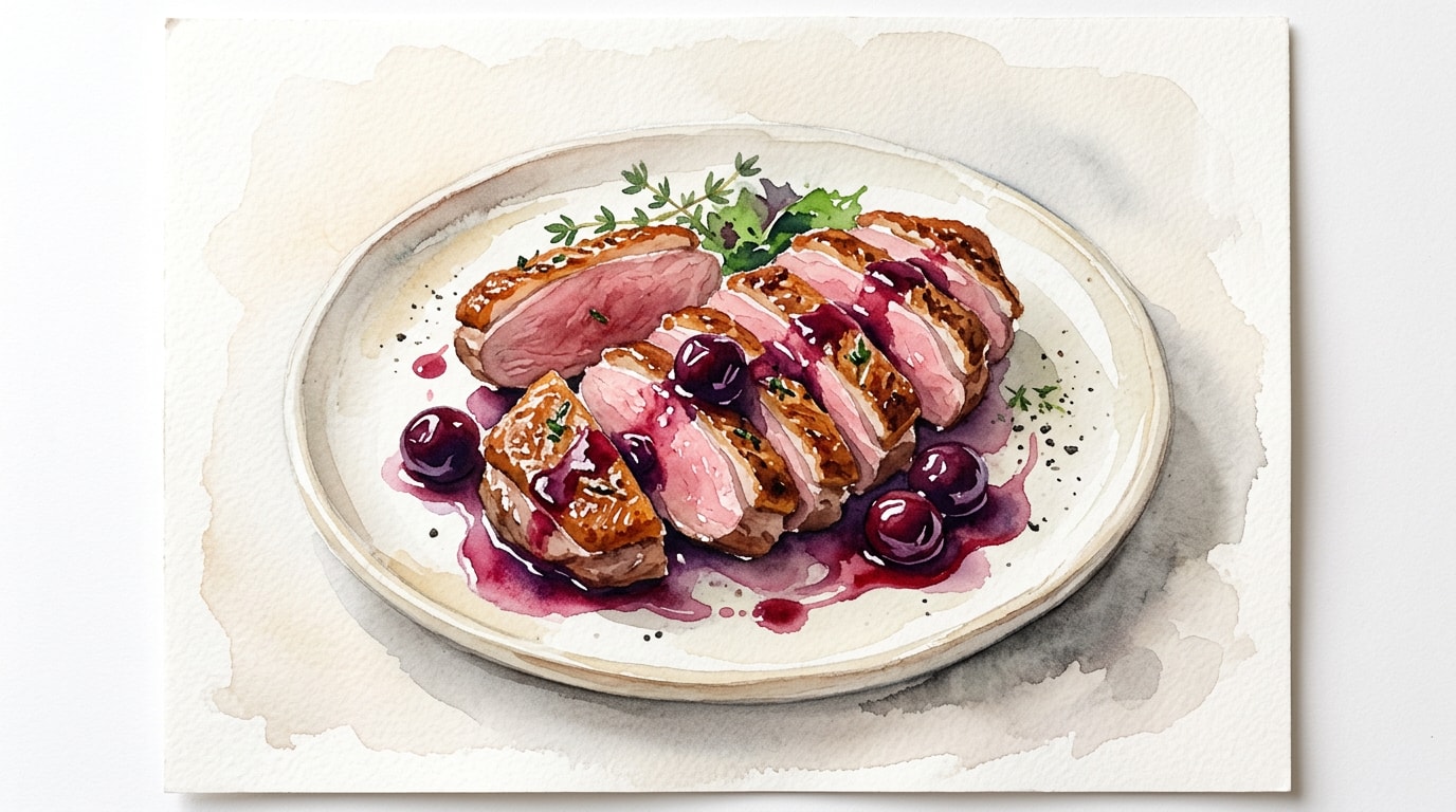 Fan the sliced duck breast onto warm serving plates and spoon the sweet-sour cherry gastrique generously over the top.