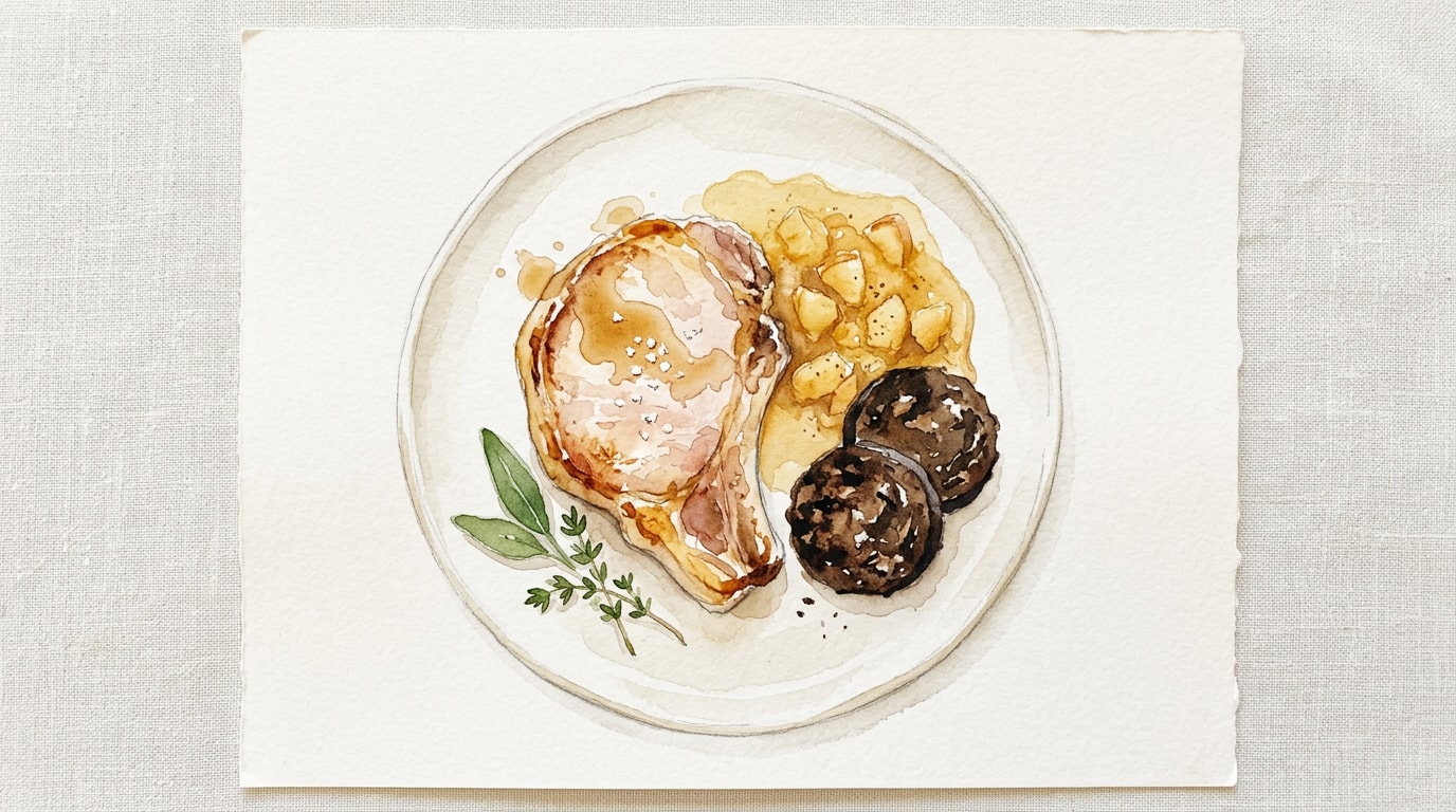Generously spoon the warm scrumpy apple sauce over the pork chops. Scatter the crispy black pudding and candied walnuts over the top to finish.