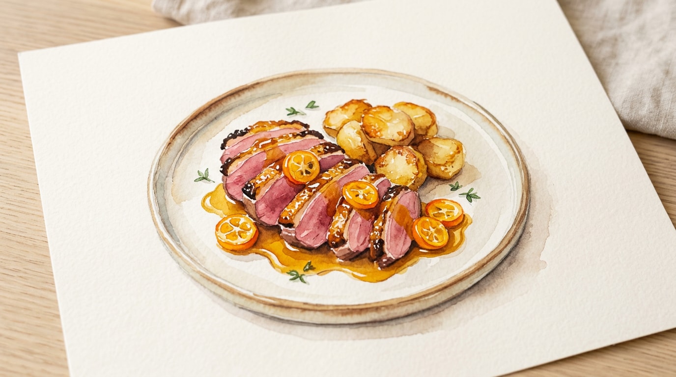 Arrange the duck slices and hot roasted potatoes on warm plates. Spoon the syrupy kumquat and orange glaze generously over the duck, finishing with a pinch of flaky sea salt on the potatoes.