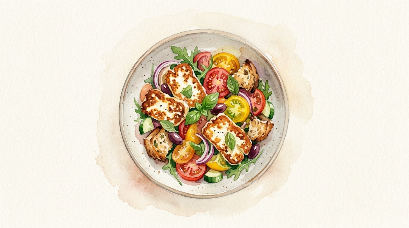 Reheating: Do not reheat the assembled salad. Leftover halloumi stored separately can be briefly warmed in a dry pan.