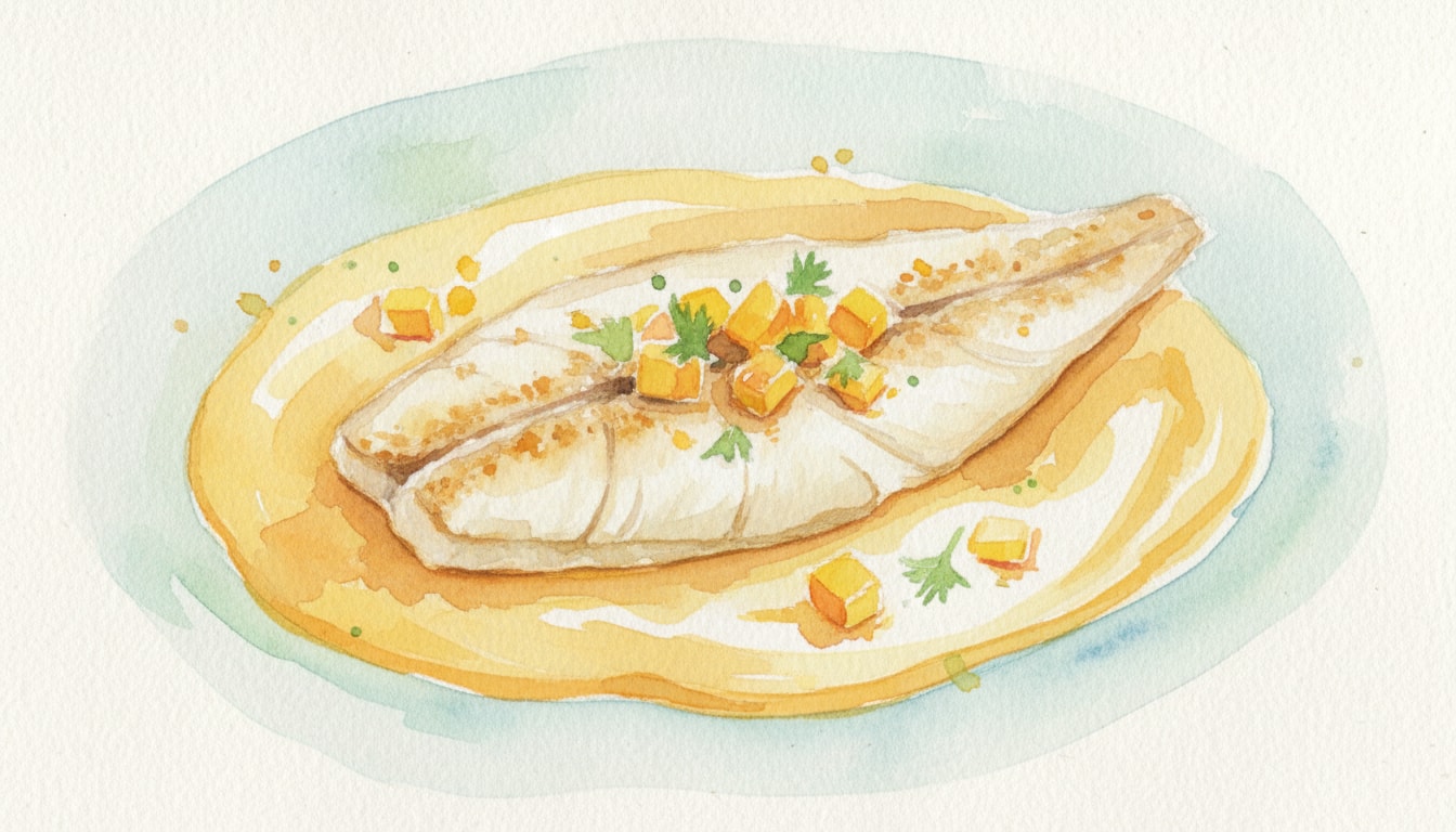 Divide the salad among plates. Place a warm sole fillet on top of the greens and drizzle generously with the mango yogurt sauce.