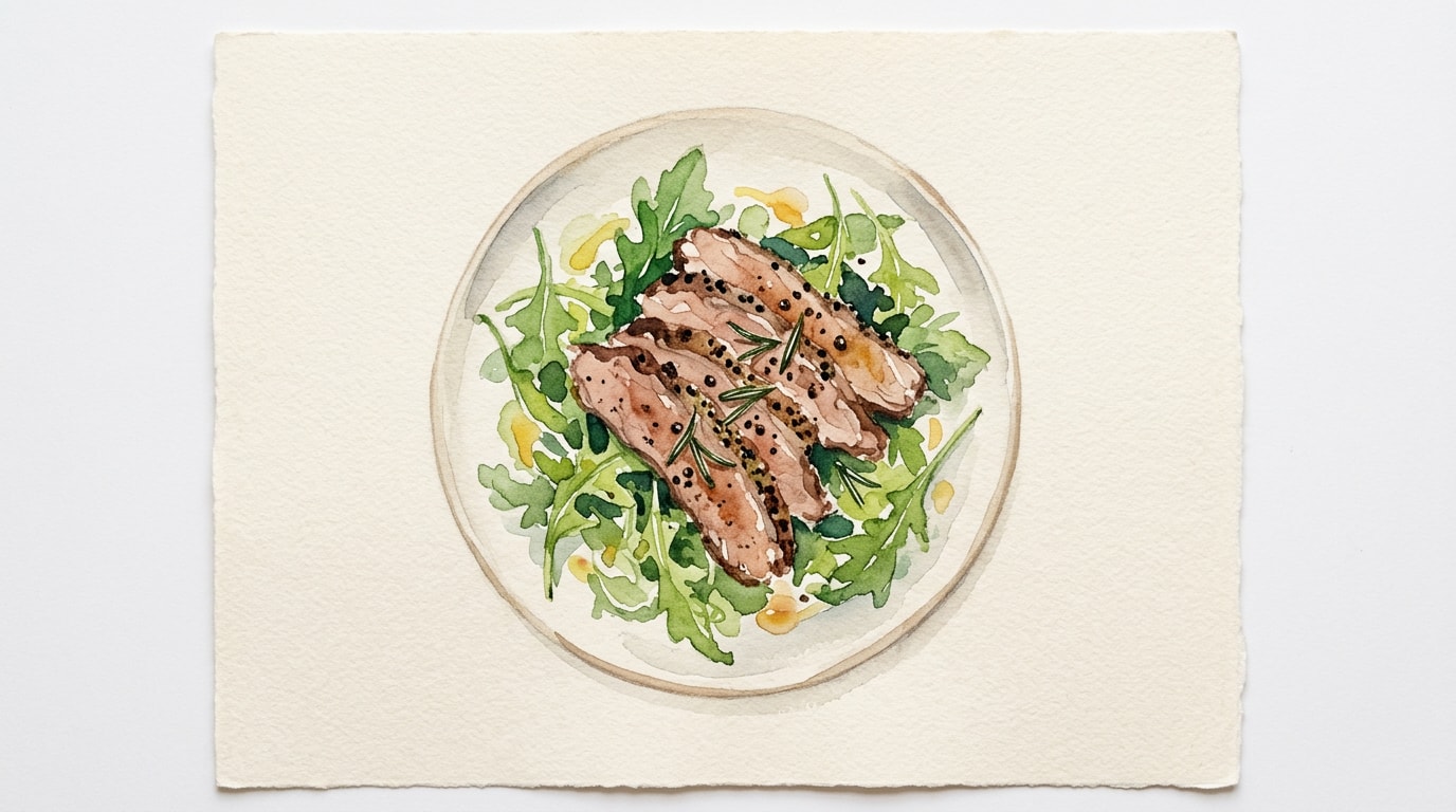 While the steak rests, combine the fresh arugula, lemon juice, remaining extra virgin olive oil, and flaky sea salt in a large mixing bowl. Toss the ingredients gently to coat the greens in the simple dressing.