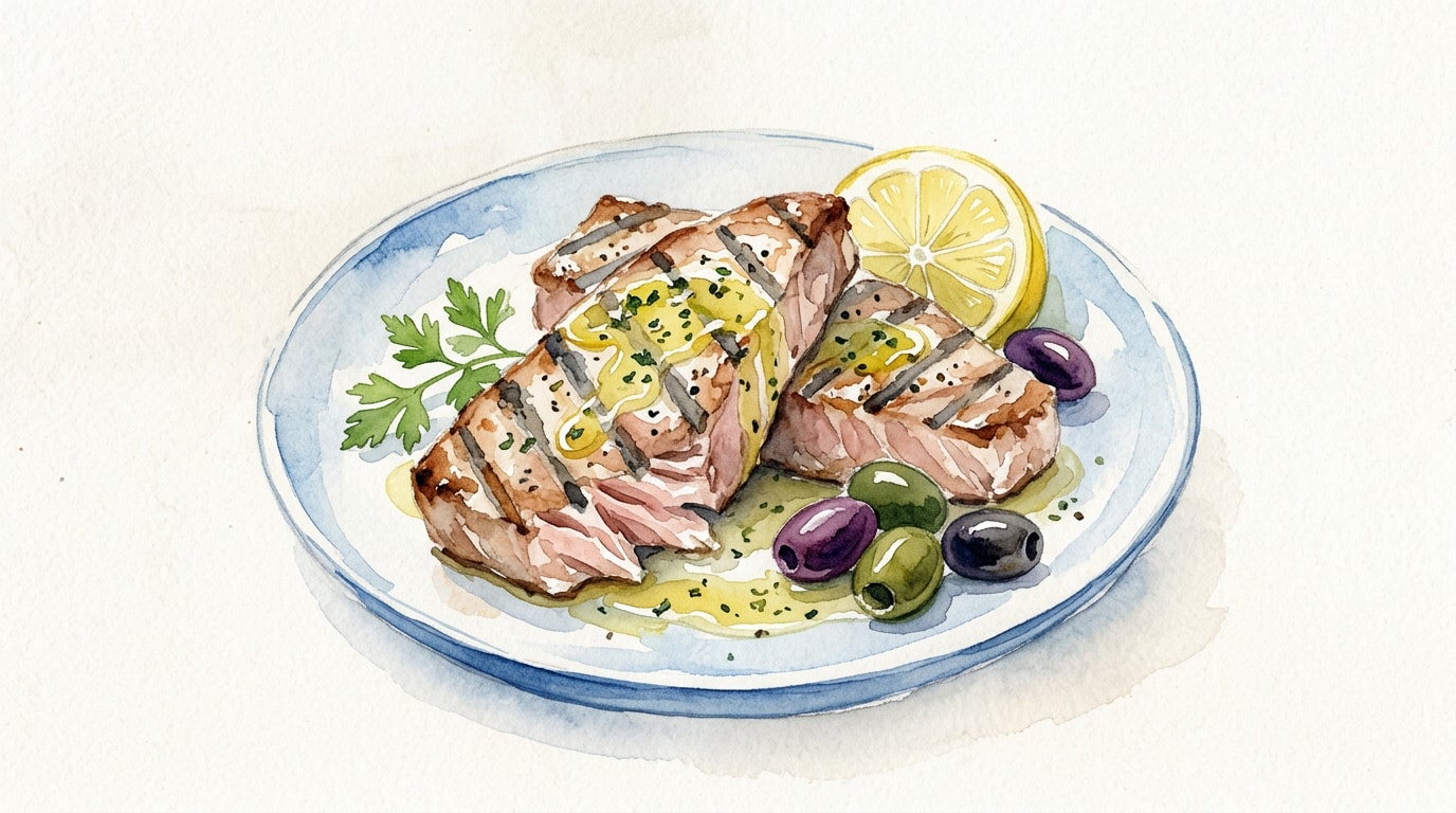 Give the lemon-olive oil sauce one final whisk to re-emulsify it, then spoon it generously over the rested tuna belly steaks. Serve immediately.