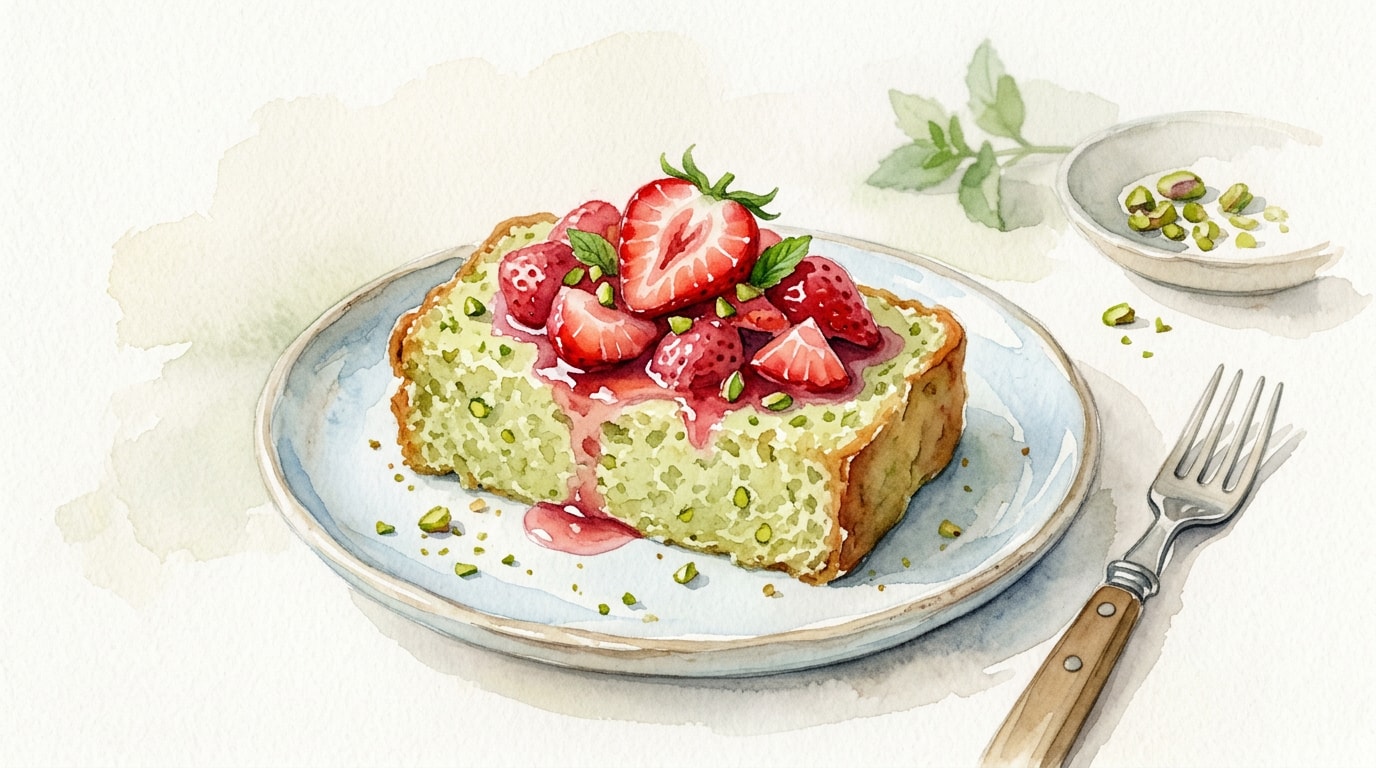 Slice the cooled pistachio pound cake into thick slices. Plate each slice and spoon the macerated strawberries with their syrup generously over the top. Finish with a dollop of whipped cream.