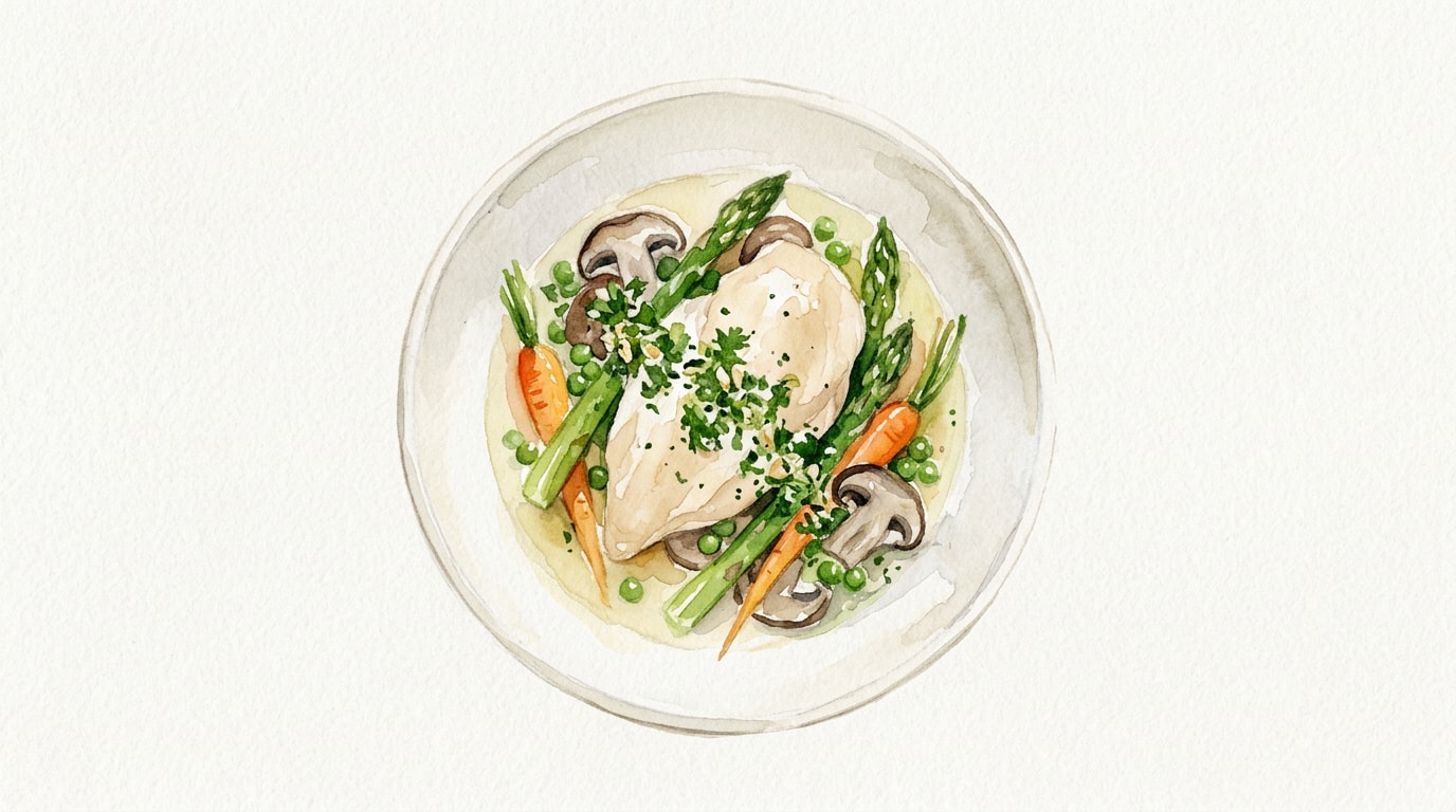 Remove the lid and add the quartered mushrooms and asparagus pieces to the pot, nestling them around the chicken. Continue to poach for an additional 4 to 5 minutes, or until the thickest part of the chicken registers 74°C (165°F) on a meat thermometer and the vegetables are tender.