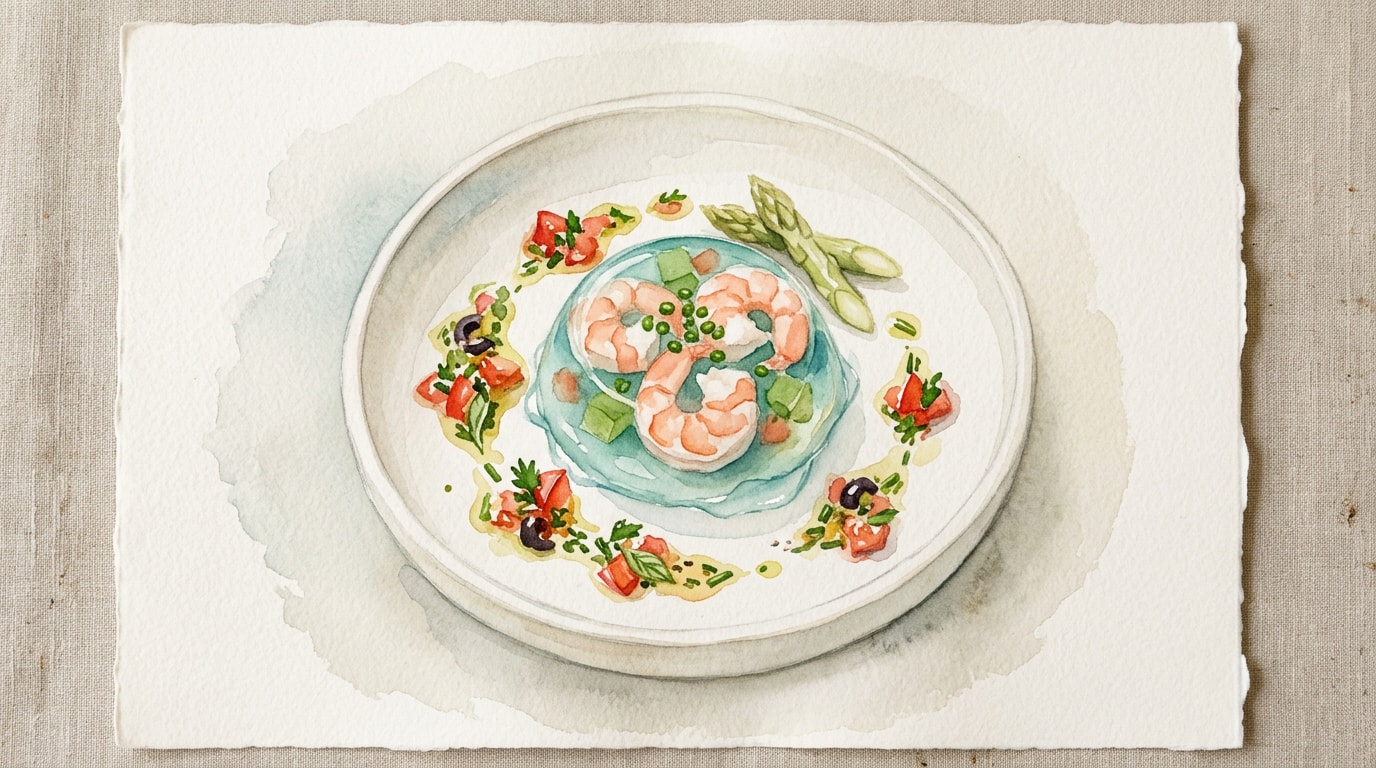 To serve, briefly dip the outside of each ramekin into hot water for 5 to 10 seconds to loosen the gelatin. Invert a chilled serving plate over the ramekin and flip to unmold the aspic. Spoon the room temperature Sauce Vierge elegantly around the base of the set aspic.