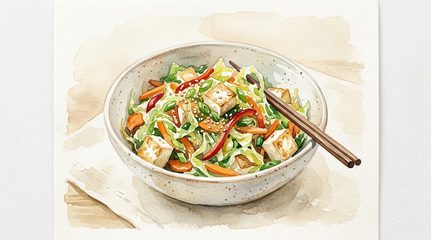 Push the tofu to the sides of the pan. Add the remaining 15ml of oil to the center, followed by the minced garlic and ginger. Sauté briefly until fragrant, then add the julienned carrots and sliced cabbage. Stir-fry constantly.