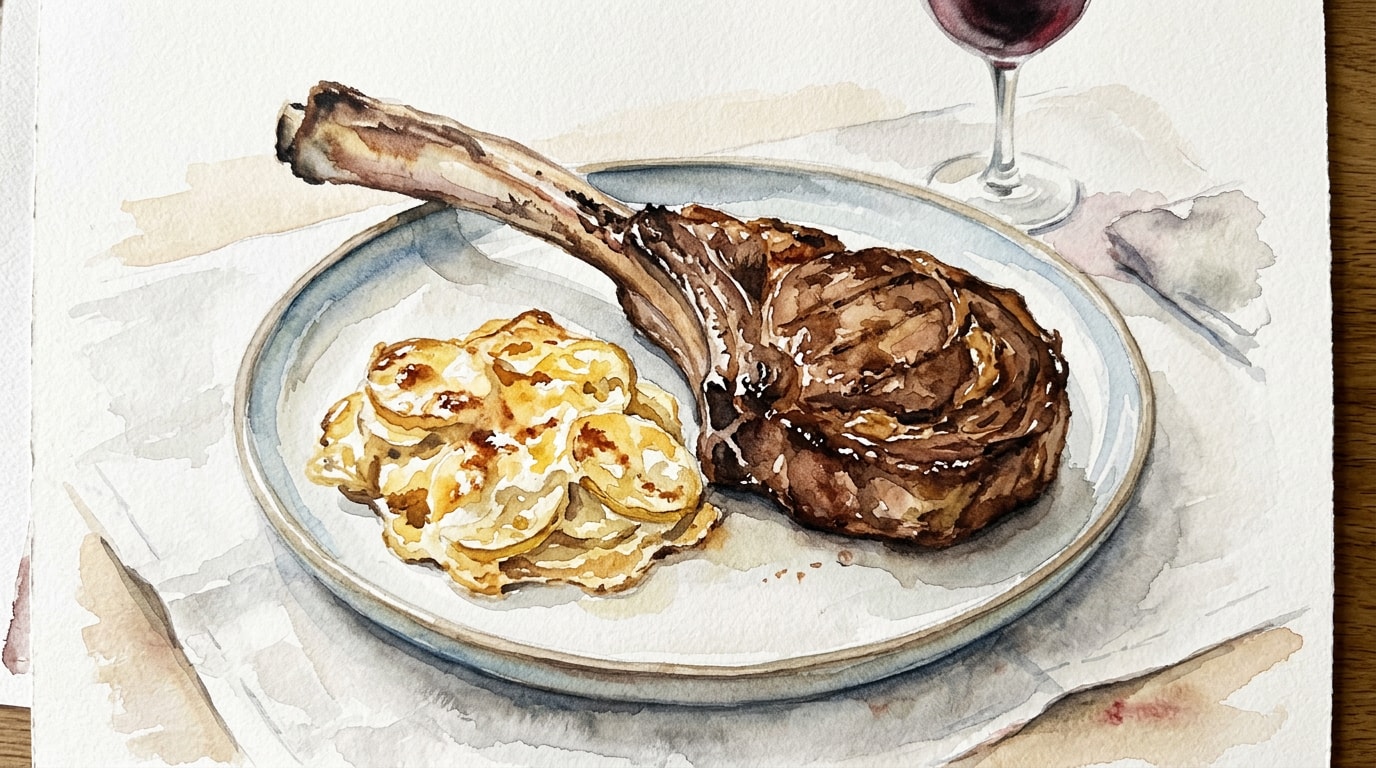 Holding the exposed rib bone, slice cleanly downward along the contour of the bone to separate the meat. Slice the resulting massive ribeye across the grain into thick slabs. Uncover the warm gratin and serve alongside the carved steak.