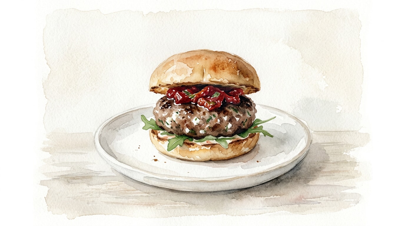 Place a handful of baby arugula on each toasted bottom bun. Top with a rested burger patty, then spoon a generous amount of the sun-dried tomato relish over the meat. Finish with the top bun and serve immediately.
