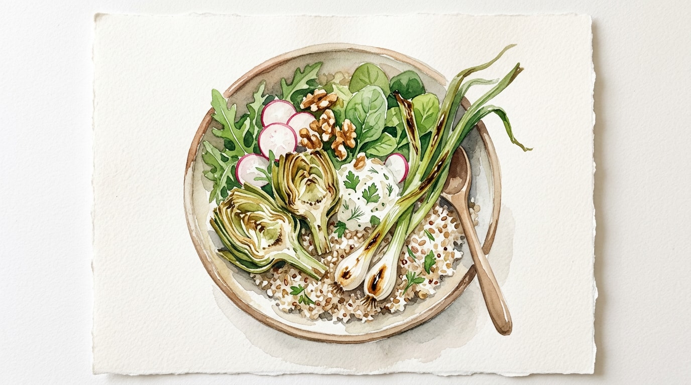 Divide the warm quinoa among four serving bowls. Top each bowl with the roasted artichokes, charred spring onions, and blanched sweet peas. Drizzle generously with the garlicky yogurt dressing and garnish with roughly chopped fresh mint just before serving.
