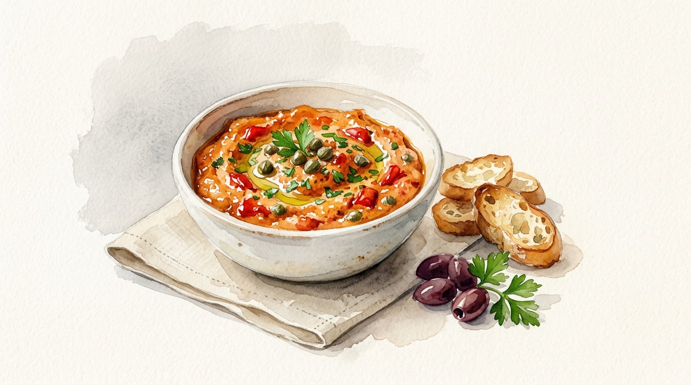 Transfer the dip to a serving bowl. Cover and refrigerate for at least 30 minutes to allow the garlic and caper flavors to meld with the sweet peppers.
