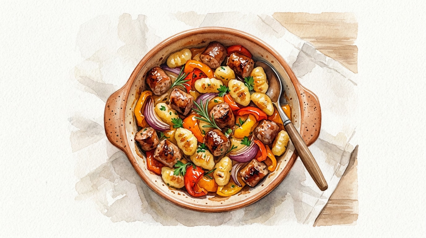 Roast in the preheated oven for 20 to 25 minutes, tossing halfway through, until the sausages are cooked through (reaching an internal temperature of 74°C/165°F), the vegetables are tender, and the gnocchi is lightly crisped on the outside.