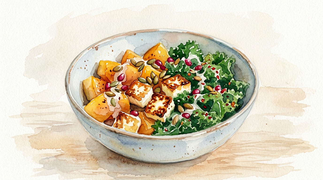 Arrange the warm roasted squash over the bed of spicy kale. Top with the crispy fried halloumi slices. Garnish with toasted pepitas and a drizzle of honey if using. Serve immediately while the cheese is still warm and pliant.