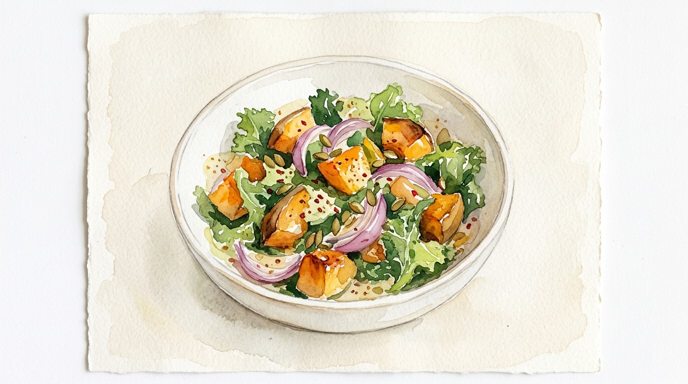 Reheating: Best served warm or at room temperature. Microwave the squash gently before tossing with cold or room-temperature kale.