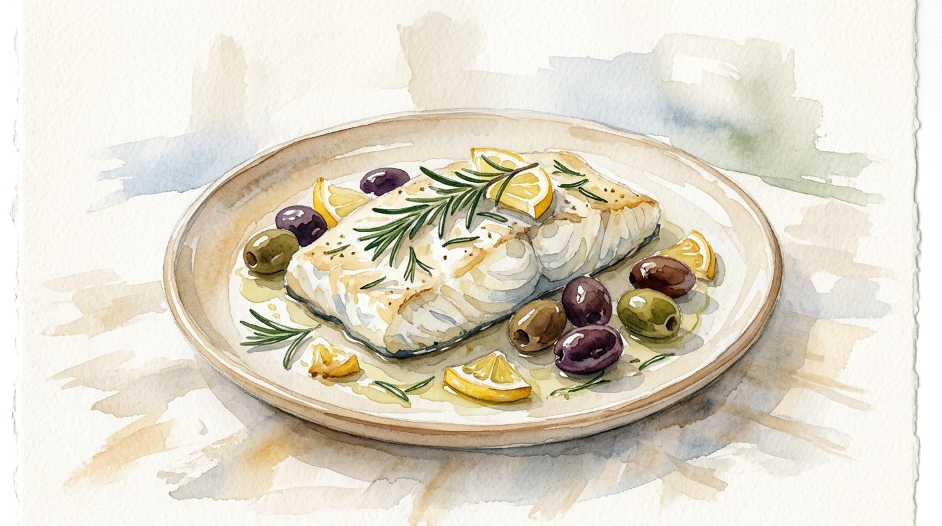 Place the dried halibut fillets carefully on top of the lemon and rosemary bed. Season the fish generously on all sides with the kosher salt and freshly ground black pepper, then drizzle the extra virgin olive oil evenly over the fish and the surrounding olives.