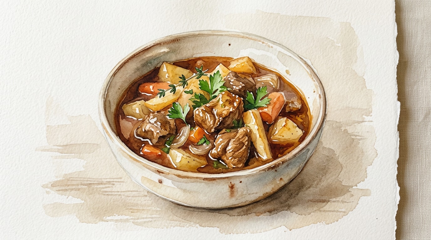 Return the seared lamb and any resting juices from the plate to the pot along with the cubed potatoes. Pour in the beef broth and submerge the rosemary sprigs, thyme sprigs, and bay leaves. Bring the liquid to a gentle boil, then cover with a tight-fitting lid. Reduce the heat to low and simmer gently for 1 hour and 30 minutes. The lamb is ready when it is completely fork-tender and reaches an internal temperature of at least 90°C/195°F, signaling that the tough collagen has successfully broken down into gelatin.