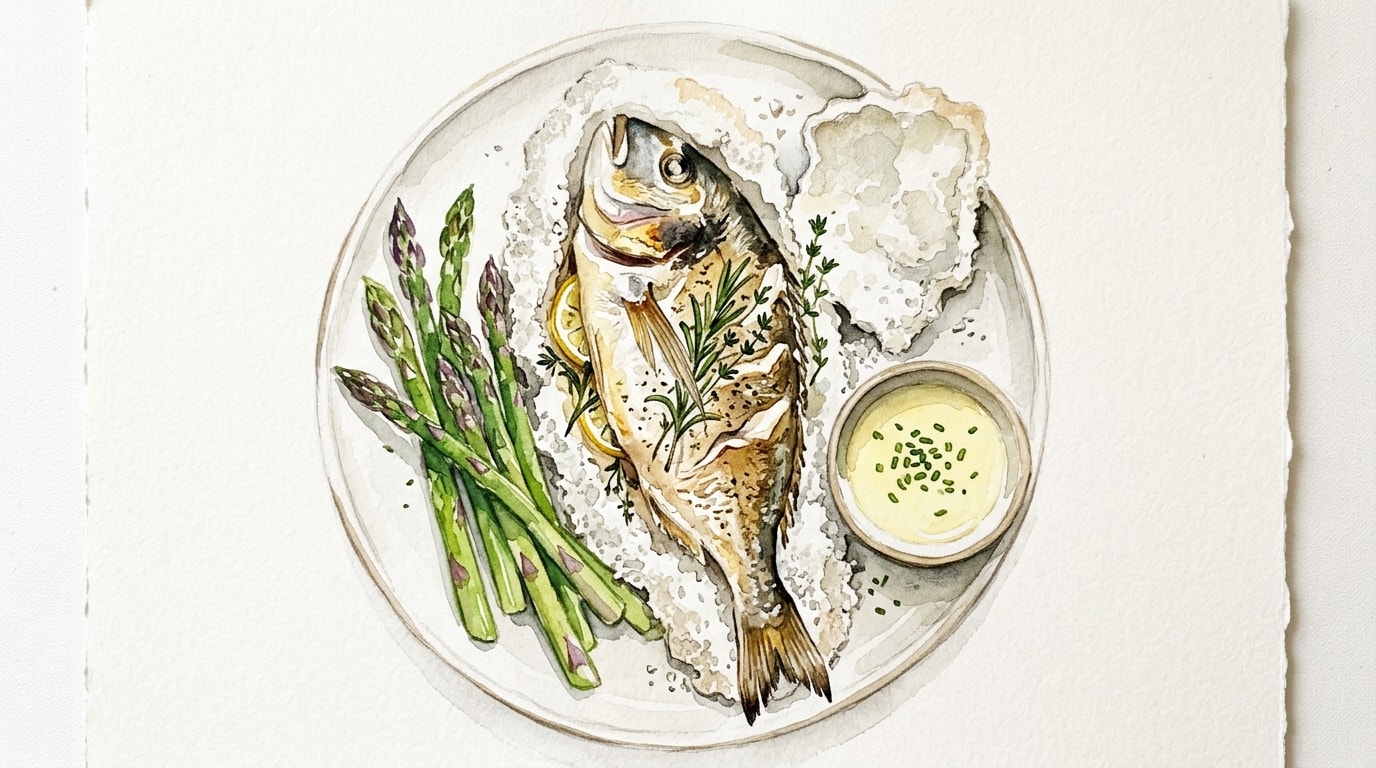 Using the back of a heavy spoon, strike the edges of the baked salt crust to crack it open. Carefully lift away the hardened salt and peel back the skin of the fish. Fillet the warm sea bream and serve immediately with the asparagus and beurre blanc.