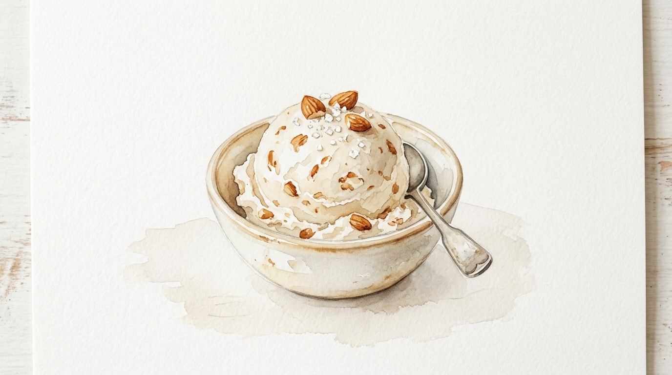 During the last two minutes of churning, gradually add the chopped salted toasted almonds so they distribute evenly. Transfer the ice cream to a freezer-safe container and freeze for at least 4 hours to firm up before serving.