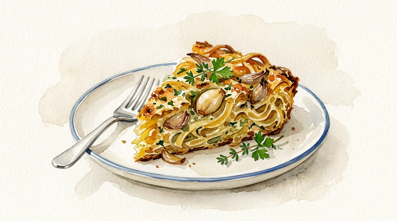 Bake the pasta cake at 190°C/375°F for 30 to 35 minutes, or until the top is deeply golden brown, crispy on the edges, and the center feels firm and set.