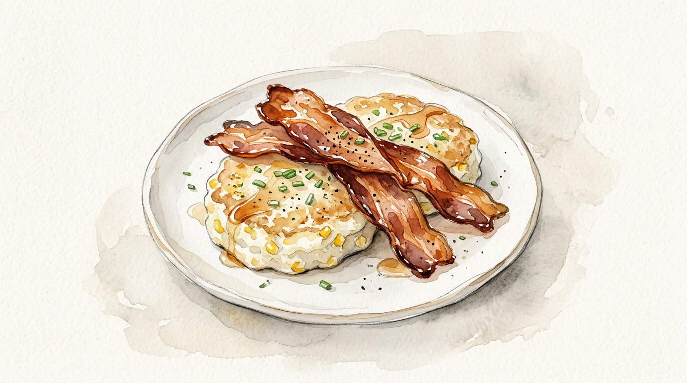 Serve the warm savory corn cakes immediately, topped with slices of the crispy maple-glazed bacon.