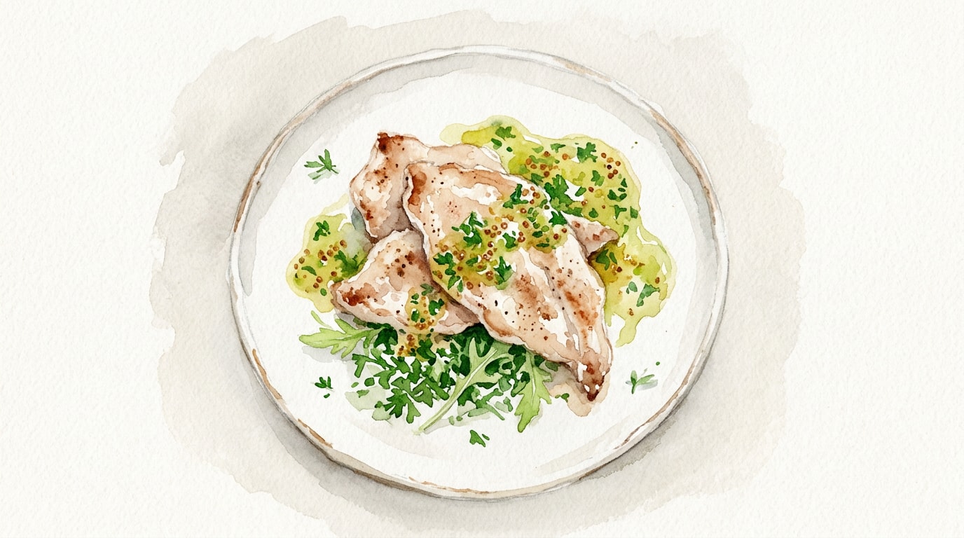 Transfer the rested rabbit paillards to individual serving plates. Spoon the warm mustard-parsley sauce generously over the top of the meat.