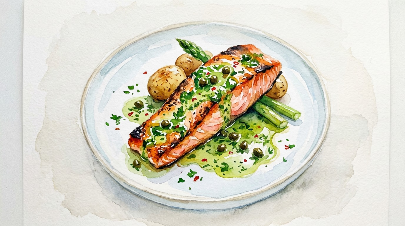 Spoon the vibrant parsley and caper sauce generously over the rested salmon fillets. Serve immediately.