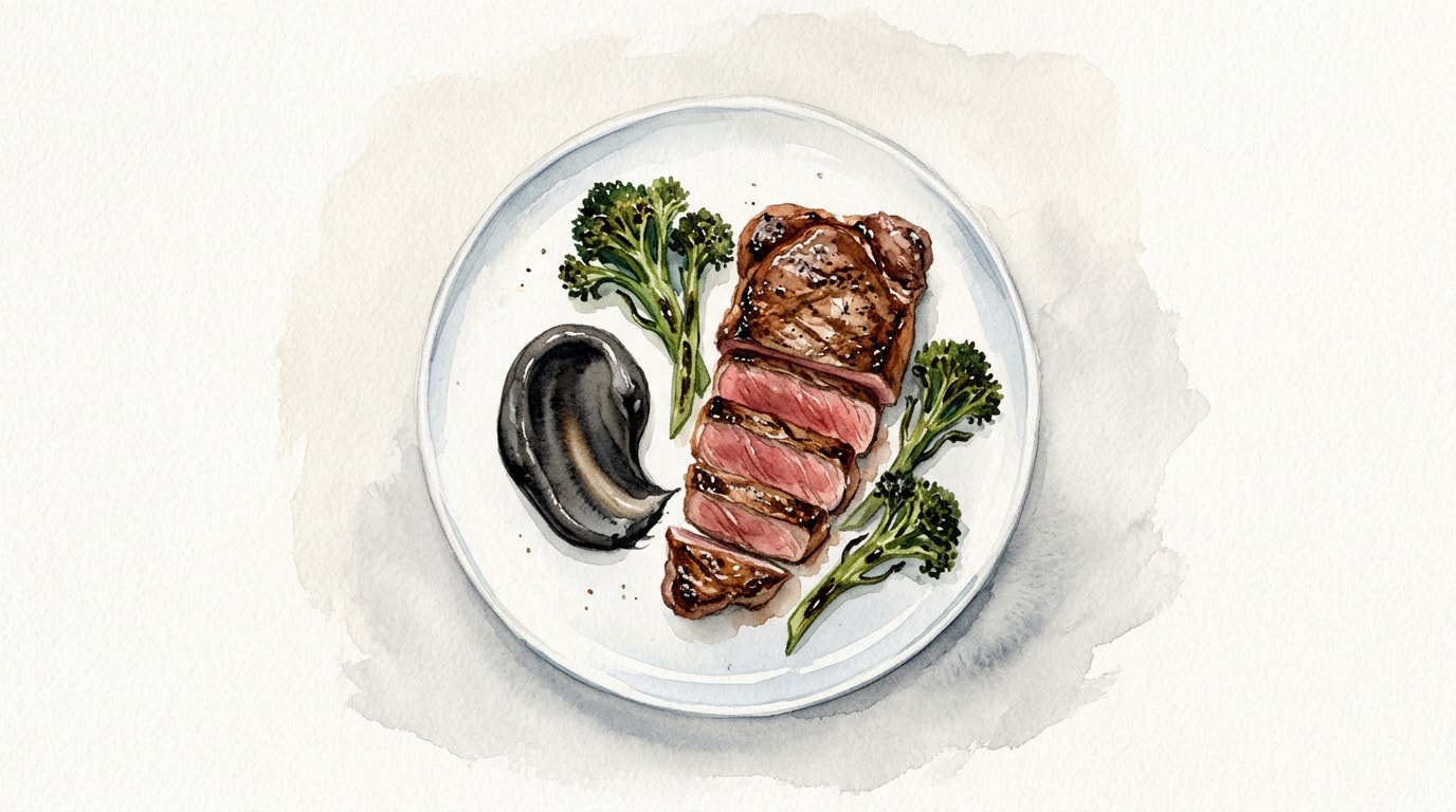 Slice the rested steak against the grain into thick strips. Spoon a generous swoosh of the warm black garlic purée onto each plate. Arrange the charred sprouting broccoli next to the purée, and shingle the steak slices alongside. Pour any resting juices from the cutting board over the beef.
