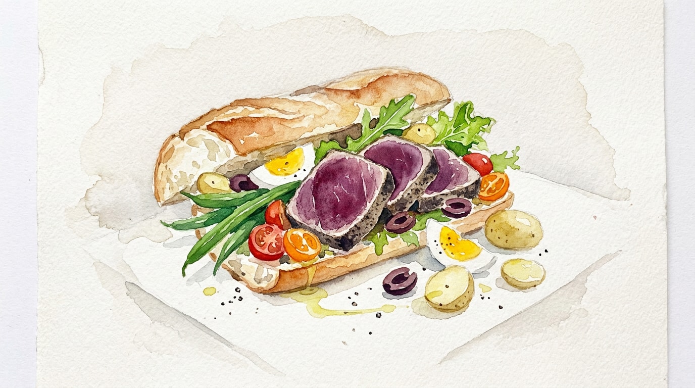 Spread the black olive tapenade evenly on the bottom half of the toasted baguette. Layer the butter lettuce over the tapenade to create a moisture barrier, followed by the tomato slices and the sliced seared tuna. Top with the remaining baguette half, press down gently, and cut the sandwich in half to serve.