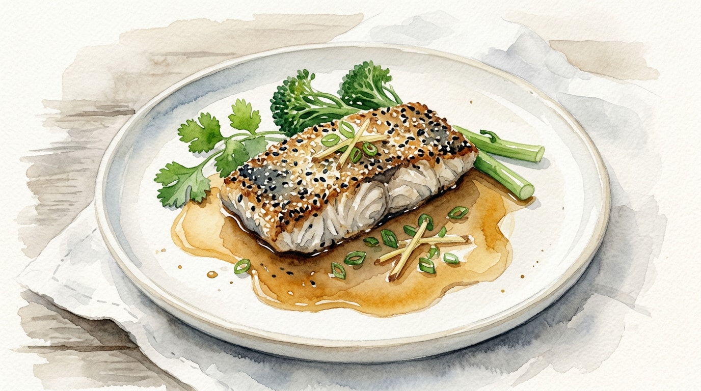 Transfer the rested sea bass to serving plates. Spoon the warm ginger soy butter sauce around the base of the fish, being careful not to pour it directly over the top to keep the sesame crust crispy. Garnish with sliced scallions and serve immediately.