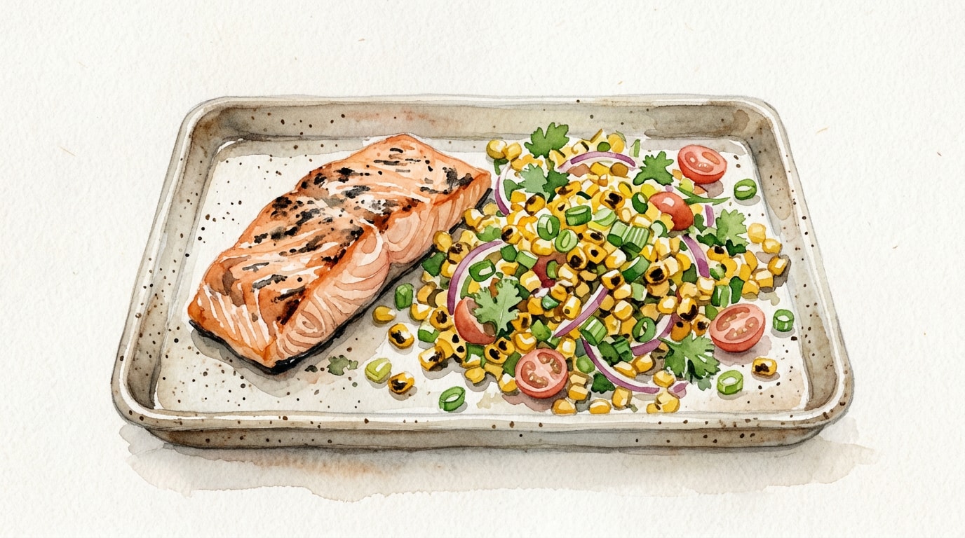 Transfer the loaded sheet pan to the oven. Broil for 8 to 10 minutes, rotating the pan halfway through the cooking time. The salmon is done when it develops a deeply browned crust and reaches an internal temperature of 63 Celsius or 145 Fahrenheit, while the tomatoes should burst and the corn should begin to char.