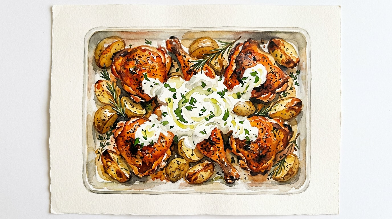 While the chicken and potatoes are roasting, prepare the garlic yogurt sauce. In a small mixing bowl, whisk together the greek yogurt, grated garlic, lemon juice, and salt until smooth. Set aside to let the flavors meld.
