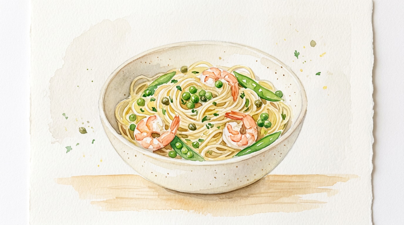 Add the drained spaghetti, sweet peas, and cooked shrimp back to the skillet. Toss vigorously to coat everything in the sauce. If the sauce is too thick, splash in reserved pasta water 30ml at a time until a glossy consistency is achieved.