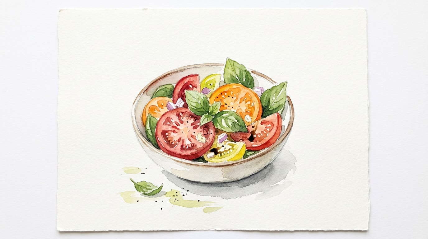- Never refrigerate tomatoes before or after making this salad. Cold temperatures irrevocably damage the flavour-producing enzymes and create a mealy texture.