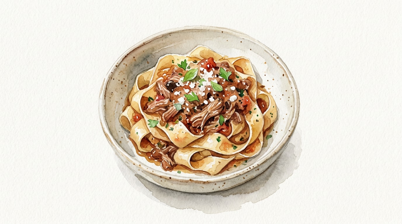 Add the drained pasta directly into the Dutch oven with the pork ragù. Toss thoroughly to coat the pasta ribbons entirely, adding splashes of the reserved pasta water as needed to create a glossy emulsion that clings to the noodles. Serve immediately, garnished with freshly grated Parmigiano Reggiano.