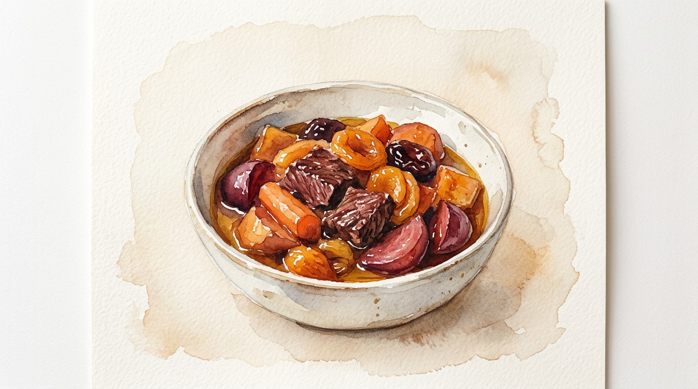 Remove the pot from the oven. Carefully stir in the pitted prunes. Return the covered pot to the oven and braise for a final 30 minutes until the meat is completely fork-tender and the sweet potatoes are soft but holding their shape.