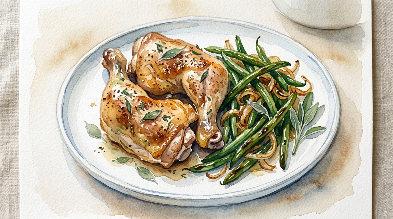 Pat the chicken legs completely dry with paper towels to ensure the skin can render properly. Season the chicken heavily on all sides with salt and pepper. Arrange the chicken legs skin-side up on top of the green beans. Scatter the remaining sage leaves around the chicken.