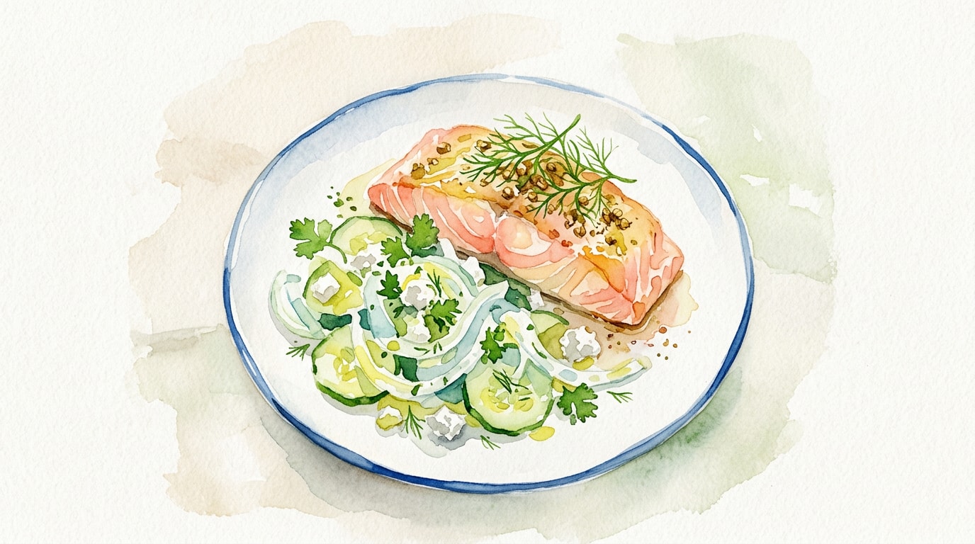 While the salmon roasts, combine the sliced cucumbers, crumbled feta, lemon juice, chopped dill, and salt in a mixing bowl. Toss gently to combine.