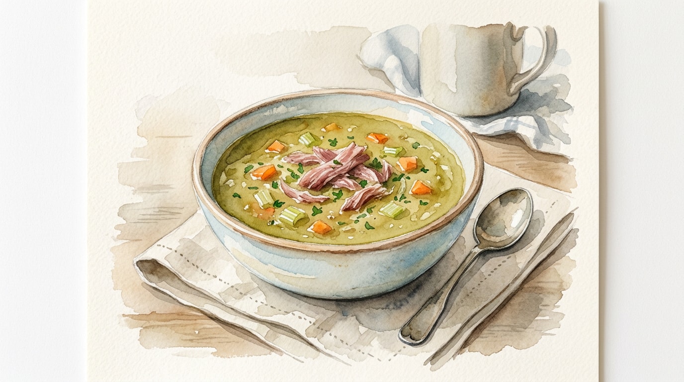 Return the shredded ham to the soup. Locate and discard the bay leaves and bare thyme stems. Taste the soup and season with salt if necessary, bearing in mind that the smoked ham hock naturally adds a significant amount of sodium.