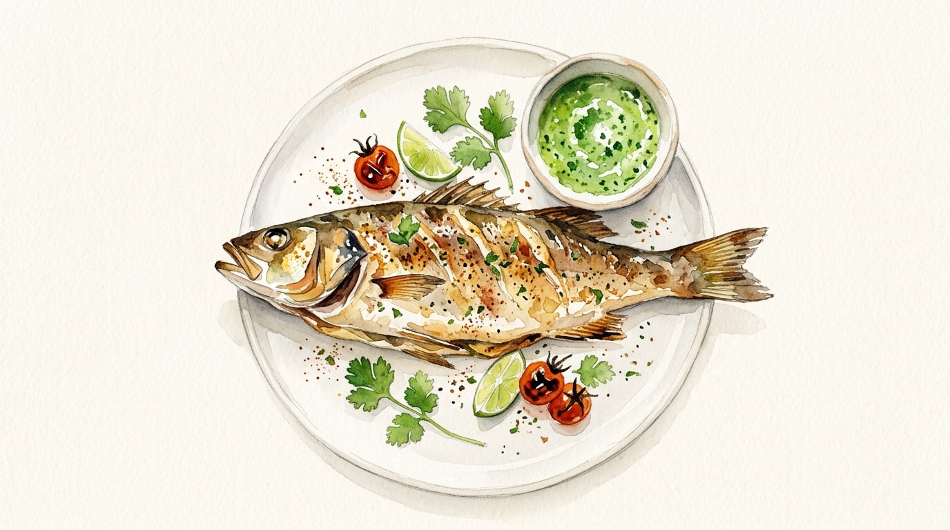 Rub the fish thoroughly with 15ml of olive oil, ensuring it penetrates the scored cuts. Season evenly inside and out with the salt, smoked paprika, and ground cumin. Stuff the main cavity with the sliced limes and fresh cilantro sprigs.