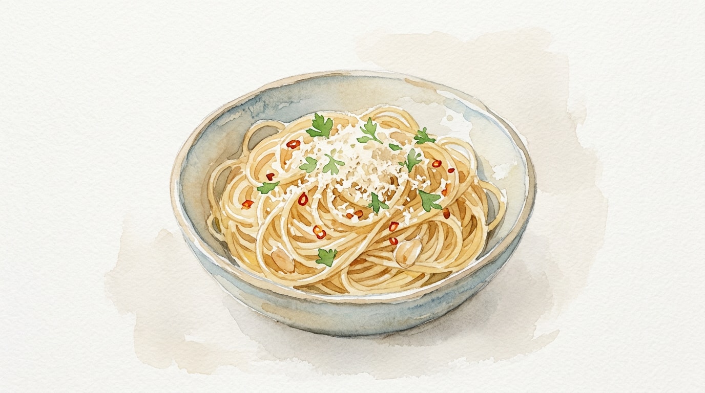 About 4 minutes before the pasta is ready, combine the extra virgin olive oil, sliced garlic, and chili flakes in a cold, wide skillet. Place over medium-low heat and cook gently until the garlic turns a pale blonde color.