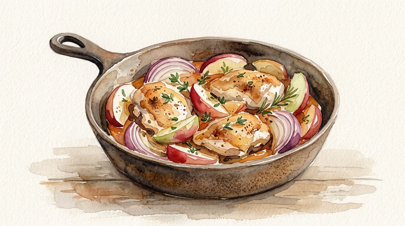 Return the chicken and any resting juices to the skillet. Reduce heat to medium-low and simmer for 2 minutes, allowing the sauce to reduce slightly and coat the chicken and apples. Remove from heat and rest for 5 minutes before serving.