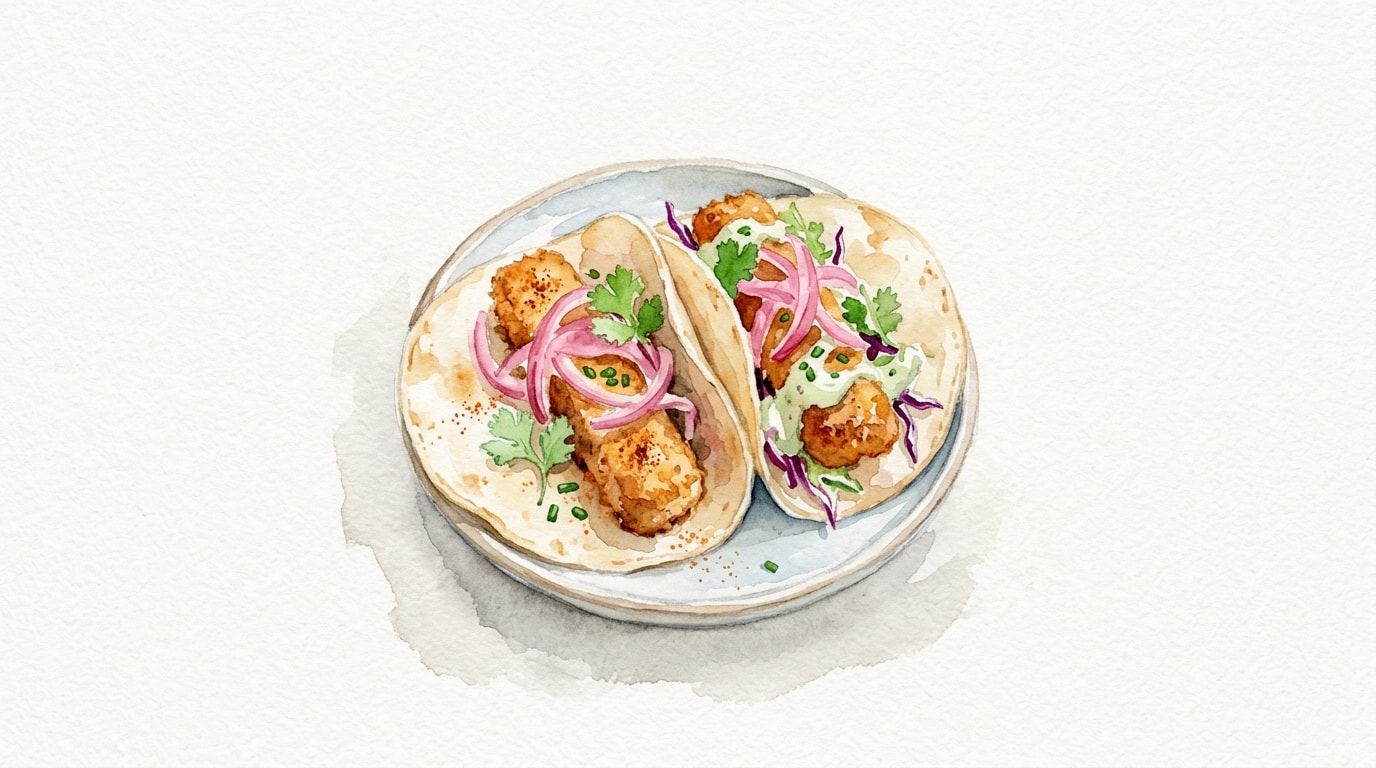 Spread a generous spoonful of lime crema onto the center of each warm tortilla. Top with two spiced fish fingers, a heap of pickled red onions, and a sprinkle of fresh coriander. Serve immediately.