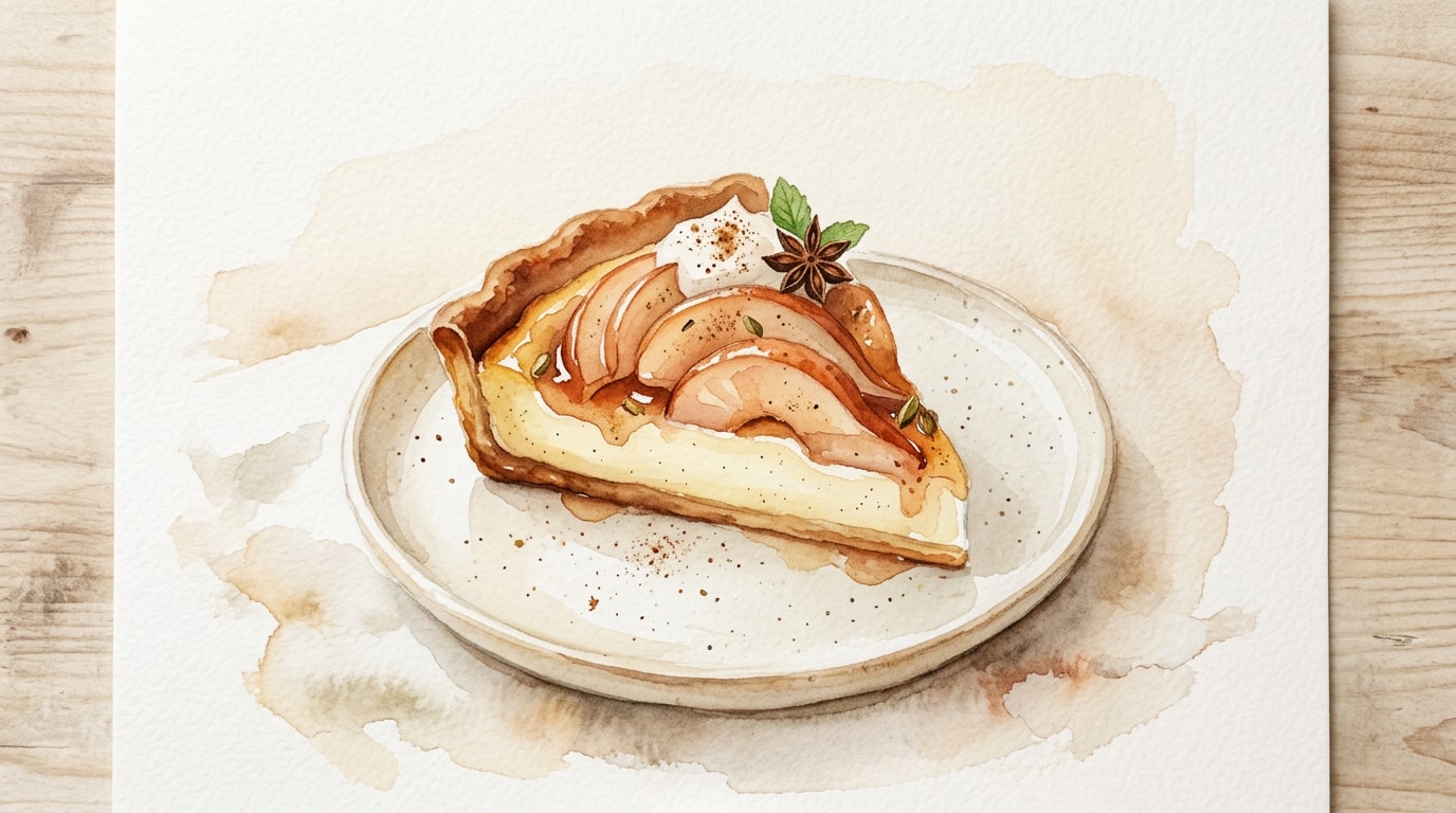 Remove the cooled pears from the syrup and slice them thinly across the width, keeping the pear shape intact. Gently press to fan the slices out slightly, and place one fanned pear half on top of the pastry cream on each tart. Garnish the edges with toasted flaked almonds and serve.