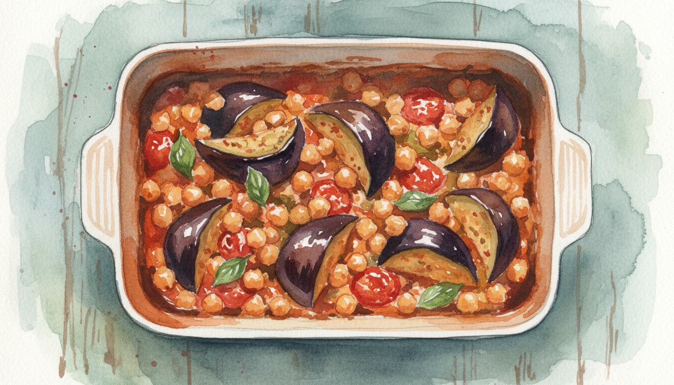 Fold the roasted aubergine and blanched green beans into the tomato-chickpea sauce gently to avoid mashing the vegetables. Taste and adjust salt or chili levels.