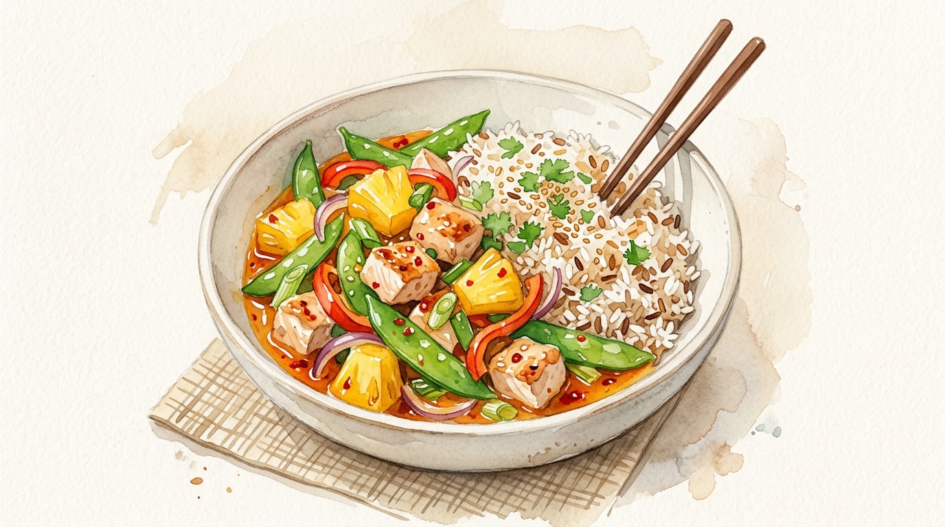 Fluff the fragrant toasted rice with a fork. Divide the rice among serving plates or bowls, and spoon the hot spicy pineapple chicken stir-fry directly alongside or over the rice.