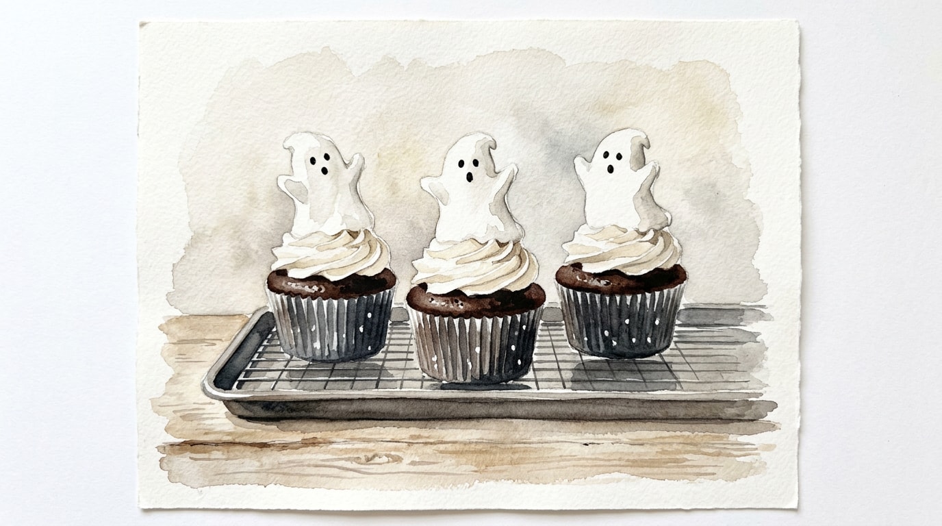Transfer the marshmallow meringue to a piping bag fitted with a large round tip. Pipe a tall, swirled mound onto each cooled cupcake by applying even pressure, building height, and slowly pulling upward while releasing pressure to create the ghost tail.