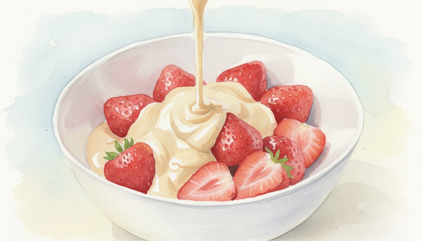 Place the prepared strawberries in a mixing bowl. If they are tart, toss them with the optional sugar and let them sit while you prepare the custard.