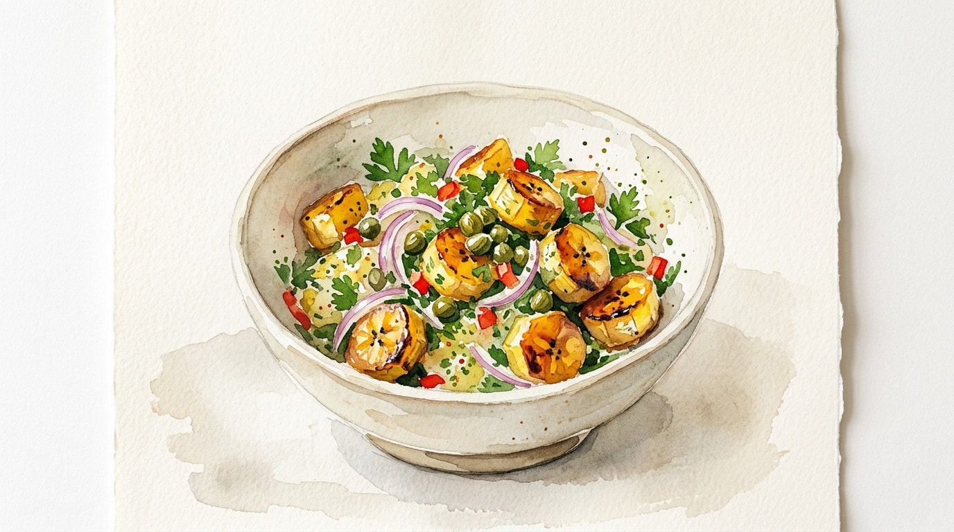 - Boiling plantains in their skins is a crucial Caribbean technique. It prevents the fruit from becoming waterlogged, preserving the necessary starch structure to hold up in a salad.
