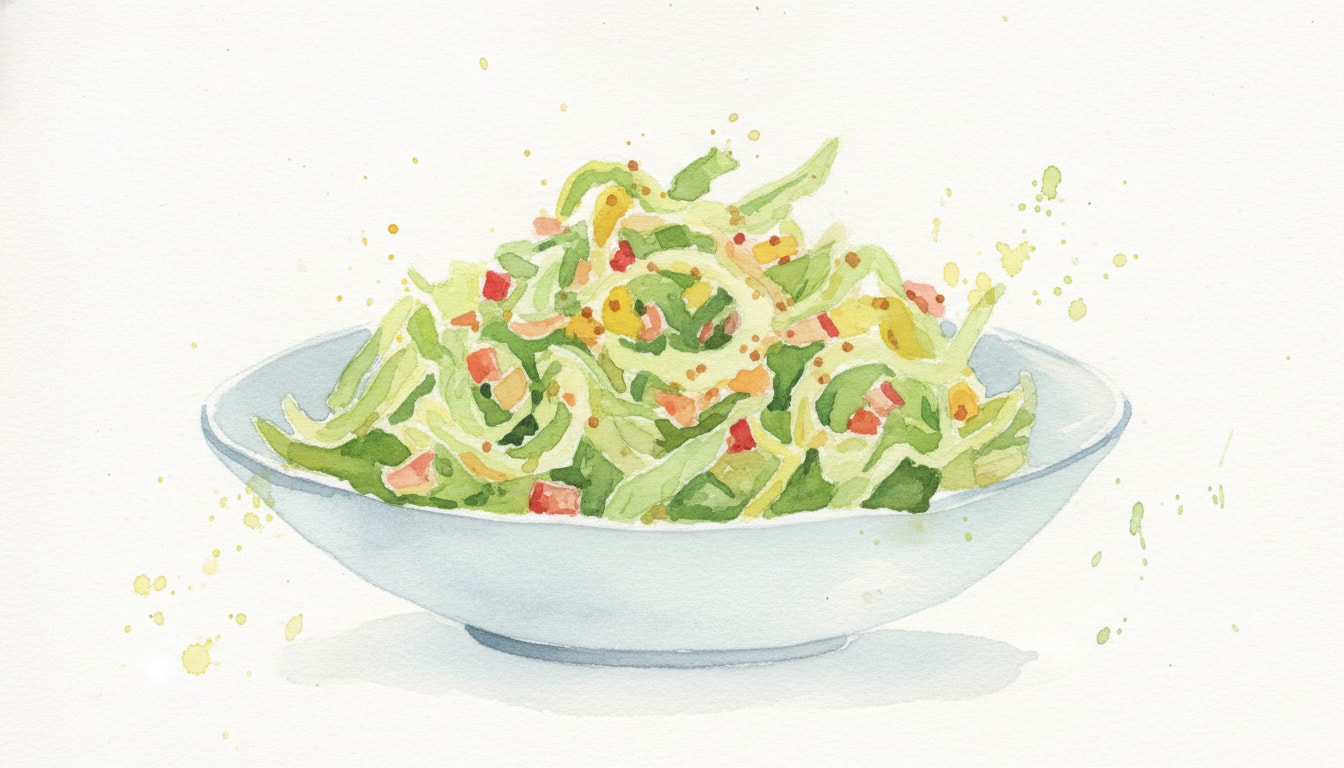 Wash the shredded lettuce in cold water and dry thoroughly using a salad spinner. It must be bone-dry for the vinaigrette to adhere.